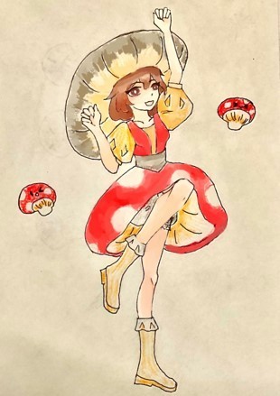 宣传海报上那个可爱的小蘑菇形象,其实也经历过两版修改。学生张依诺是公司宣传部的负责人,也是公司“商标”的创作者。最初的商标形象其实是她利用午休时间手绘出来的。“最开始我想设计一个‘元气菇’的形象,所以画了一个身穿蘑菇衣服的女孩,希望给消费者一种活力满满的感觉。”张依诺说。给老师和同学展示这幅画时,大家围绕公司的实际需求提出了改进意见。