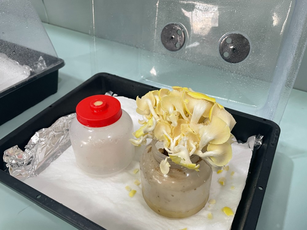 如何让榆黄菇生长的湿度保持在90%左右?在老师的指导下,两个小姑娘反复试验,找到了技术创新的突破点——给蘑菇培养箱铺锡纸。“我们做了改良,在培养箱底部铺上三层厨房纸,下面再铺一层锡箔纸,这样可以减少水分的流失,让榆黄蘑获得更好的生长环境,我们也从每天浇水变成了隔天浇水,节省了人力、提高了效率。”王姝涵说,这个创新让她们的榆黄蘑长得又大又厚实,颜色也更深更漂亮,“周末如果不能到学校浇水,也不必担心培养箱中的湿度。”