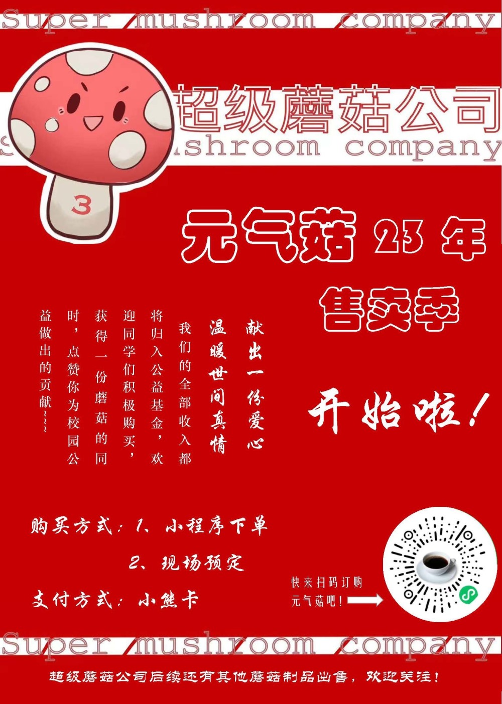 在一零一中学石油分校教学楼一层,每当师生们经过咖啡厅,都会被一张醒目的海报吸引——卡通形象的蘑菇,配上“超级蘑菇公司”六个红色大字,“元气菇2023年售卖季开始啦”的信息占据中心位置,下方印着网店的二维码。
