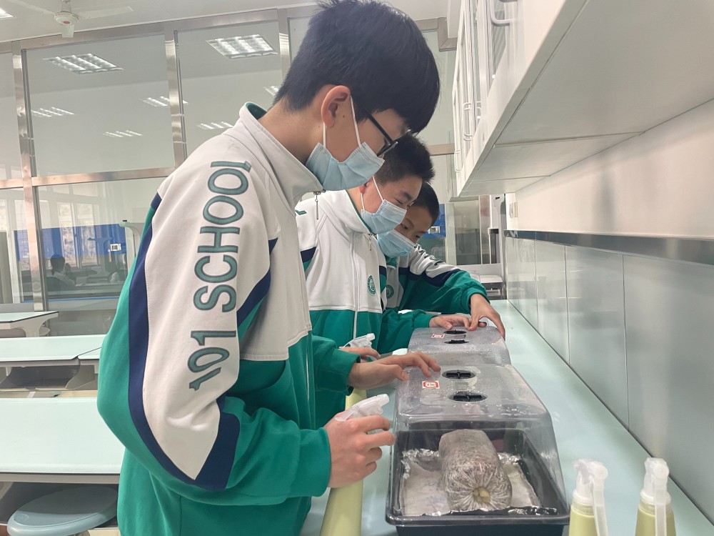 “蘑菇生长对环境的要求比较苛刻,主要有四个要素:温度、光照、湿度、空气。这四大要素同样决定了能否出菇和出菇的数量。”学生李京潞和王姝涵这组搭档在实验报告中写道,榆黄菇需要温度在18摄氏度到20摄氏度之间相对潮湿的环境,避免阳光直射,为此她们将培养箱放置在了一个相对封闭的环境,拉上纱帘,来维持蘑菇生长所需要的条件。