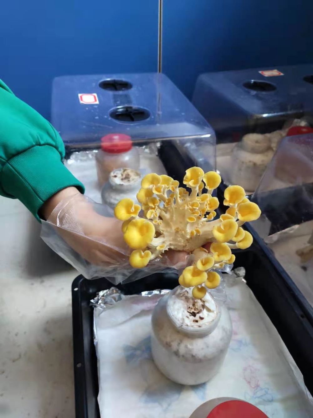 “我们的榆黄菇生长速度比较快,大概第三天的时候就陆陆续续长出了菌丝,四五天之后就可以清晰地分辨出蘑菇菌柄和菌盖。在之后的几天里,蘑菇的菌盖渐渐展开,长成了一簇簇金灿灿的榆黄菇。”李京潞说,蘑菇伞盖像大拇指大小,直径长到2至3厘米时,老师就带着大家采摘了第一茬蘑菇,由于产量小,还处于产品“研发”阶段,收获的蘑菇并没有马上销售,而是供学生们自己“尝鲜”,“亲手培养的榆黄蘑就是鲜美,我们又继续按照原来的方案培养,想要知道后续还能再生长几茬。”