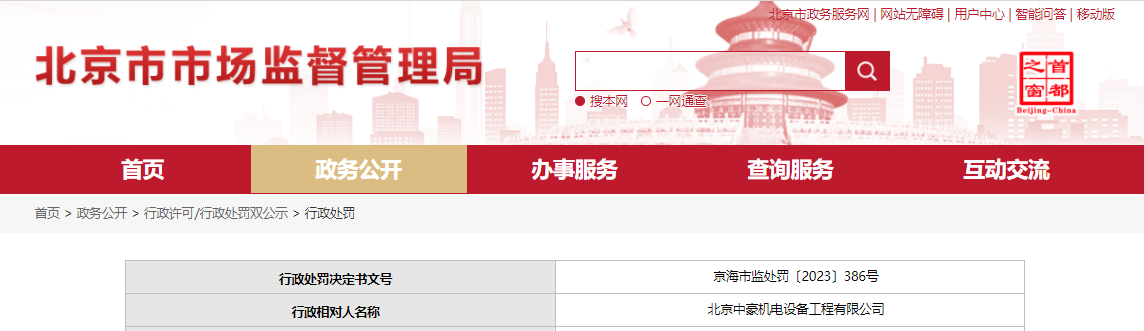 中国质量新闻网讯 近日从北京市市场监督管理局网站获悉,北京市海淀区市场监督管理局对北京中豪机电设备工程有限公司作出行政处罚。行政处罚决定书文号:京海市监处罚〔2023〕386号。