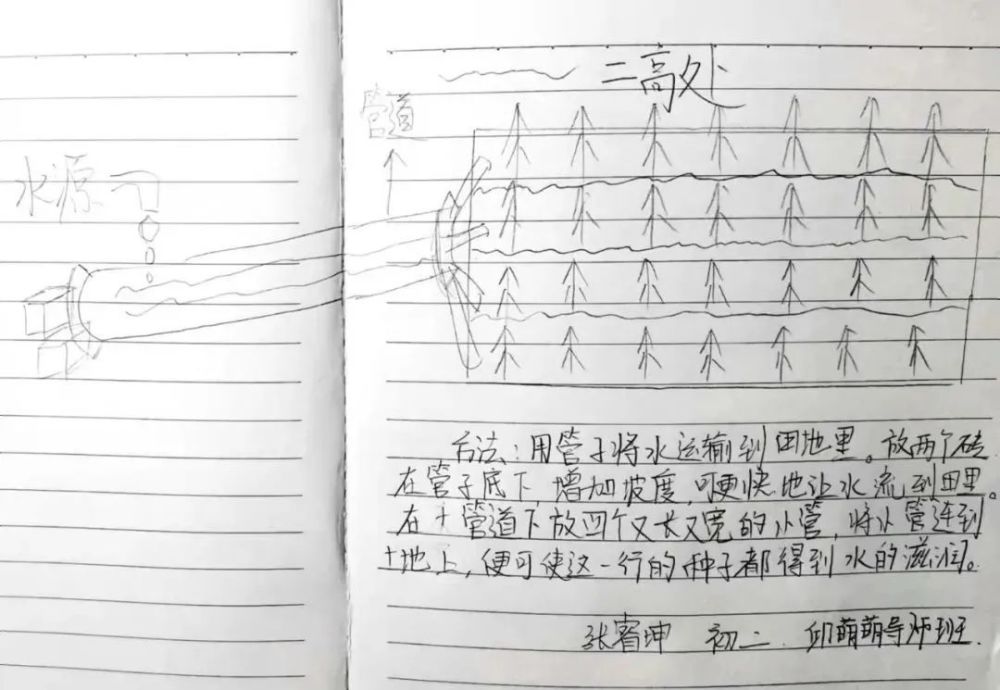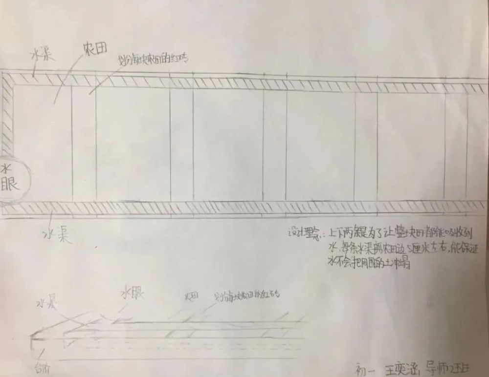 仅仅种植并不能满足北京十一晋元中学的孩子们的劳动热情,他们还要自己规划设计农场。于是学校在种植课程增加了项目式研究学习——设计学校农场的灌溉系统,解决农场引水灌溉的大问题。孩子们绘制的设计有模有样!每个人将自己的奇思妙想融入到灌溉图中,和老师探讨起来振振有词,并且亲手将自己的设计铺设成型。