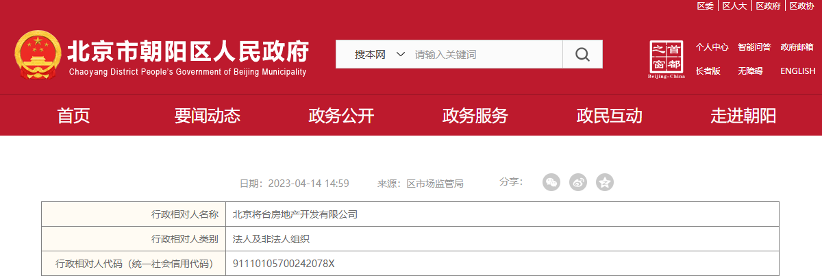 中国质量新闻网讯 近日从北京市朝阳区人民政府网站获悉,北京市朝阳区市场监督管理局对北京将台房地产开发有限公司作出行政处罚。行政处罚决定书文号:京朝市监处罚〔2023〕340号。具体信息如下: