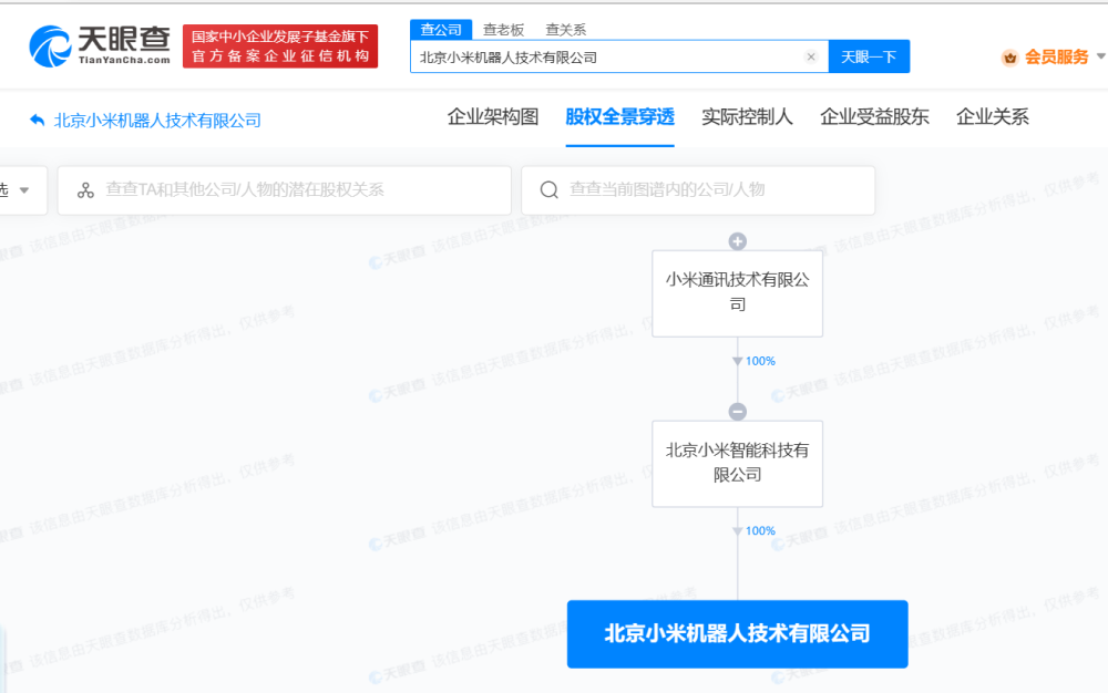 股权穿透图显示,该公司由小米通讯技术有限公司间接全资控股。