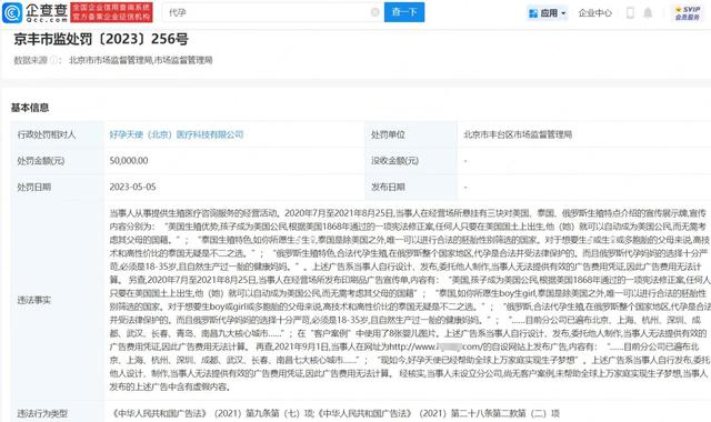 近日,好孕天使(北京)医疗科技有限公司因违法发布国外代孕广告,被北京市丰台区市场监督管理局罚款5万元。