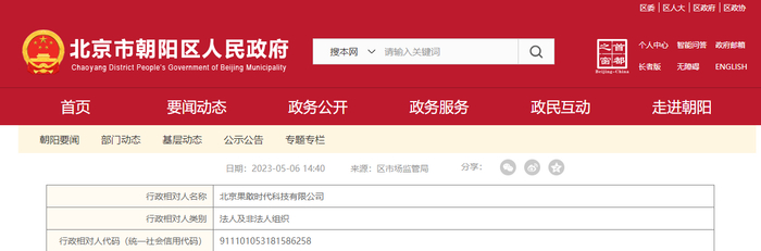 中国质量新闻网讯 从北京市朝阳区人民政府网站获悉,北京市朝阳区市场监督管理局对北京果敢时代科技有限公司作出行政处罚。行政处罚决定书文号:京朝市监处罚〔2023〕415号。