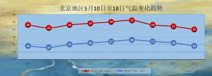据气象北京微信公众号,北京今天天气以多云为主,午后南风明显,最高气温28℃,最低气温14℃。5月11日,天气逐渐转阴,傍晚到前半夜西部北部有雷阵雨客串,雨量不大,但可能出现雷暴大风等对流天气,外出及时关注临近预报,提前做好防范。