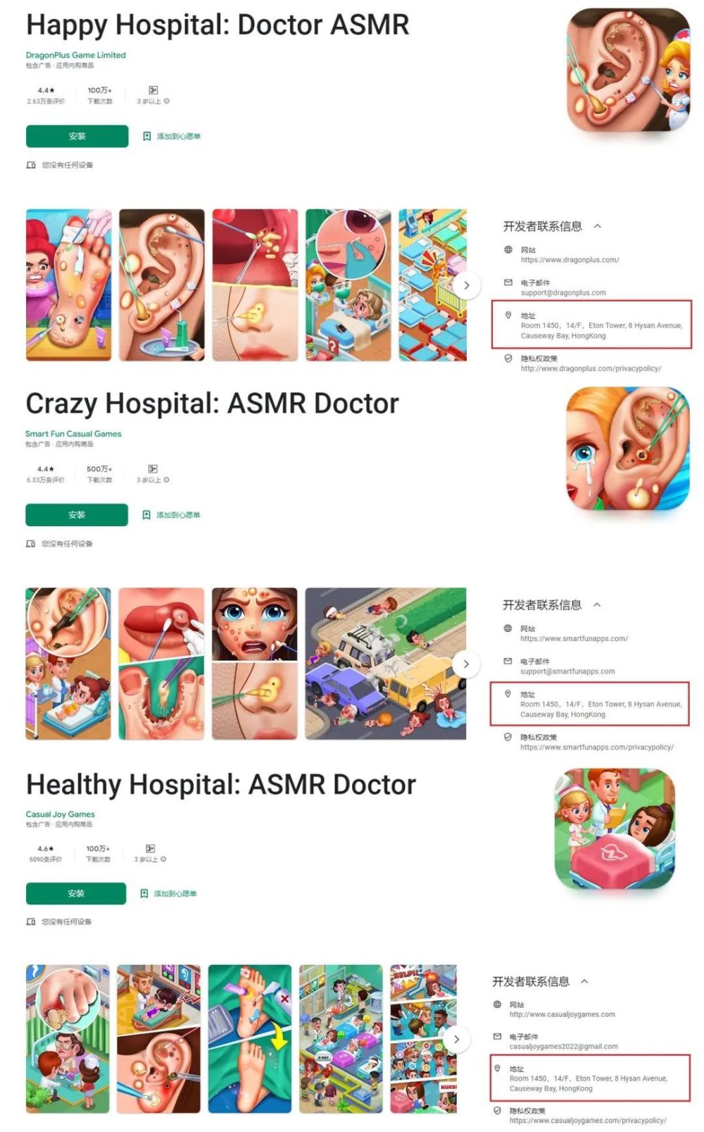 查询游戏Google Play页面也能发现,“快乐医院”、“疯狂医院”和“健康医院”三款游戏虽然出自三家不同发行商,但其在Google play上发行商自己填写的公司地址完全相同,都指向香港铜锣湾一栋大厦某间办公室。在进一步访问三款游戏发行商官网也能发现,虽然公司名、网站域名地址不同,但三家网站都使用了一样的页面布局。
