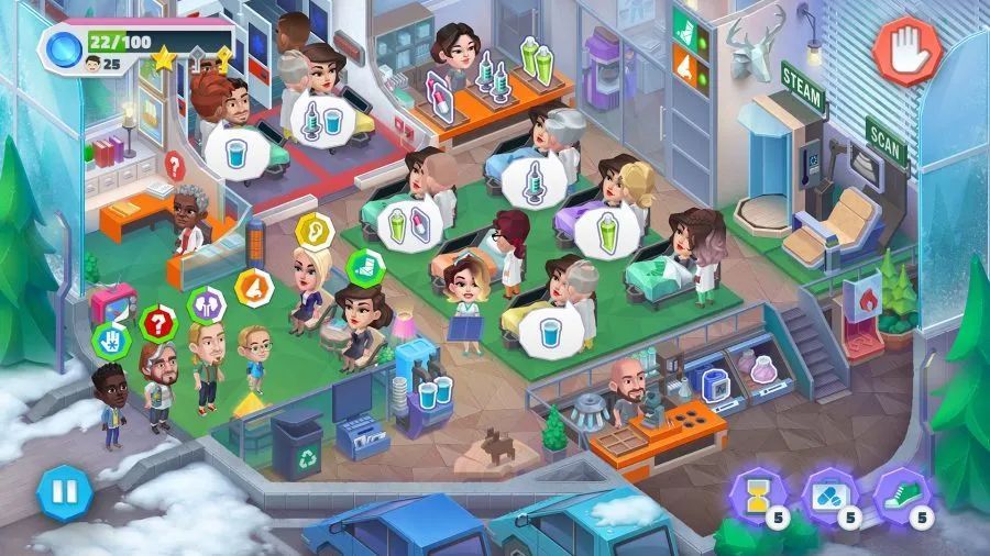 治疗过程也很直观,站在病床侧的医生会根据病人情况提示所需药物,此时护士会从药房取药或协助检查。治疗完成后,病人会自主离开、而玩家将获得奖励。