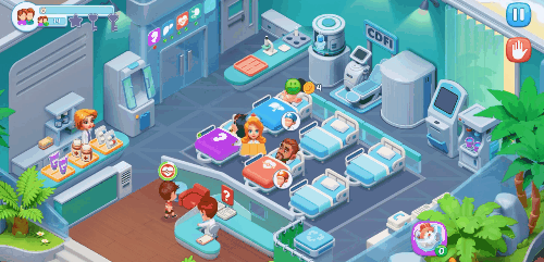 相较PC平台流行的医院模拟类游戏,《Happy Hospital》在玩法上做了一些简化,病人进入医院后会在前厅等待,无需问诊头上即会显示病症所在,一段时间后若无应对,所有排队的病人都会离开。在病人头顶进度条转完之前,玩家可以将病患拖至病床,随后医生会出现开始诊断并治疗病人。