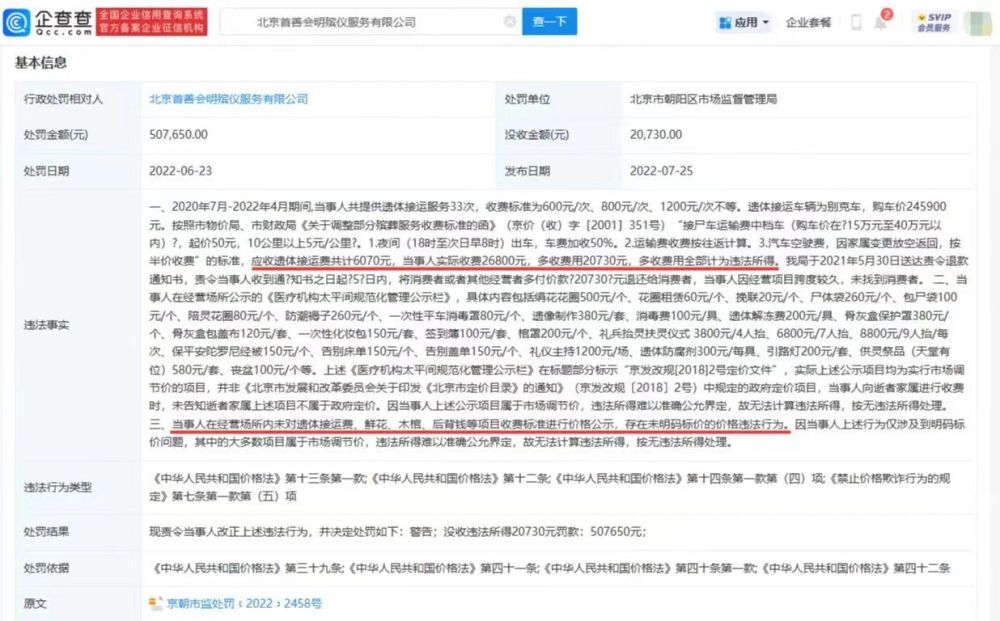 2022年6月23日,该公司因多收遗体运送费、未明码标价等问题被北京市朝阳区市场监督管理局警告,没收违法所得2万余元,罚款50余万元。(北京时间 谭孜)