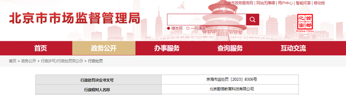 中国质量新闻网讯 5月12日,北京市海淀区市场监督管理局对北京蔚信教育科技有限公司作出行政处罚。行政处罚决定书文号:京海市监处罚〔2023〕8306号。