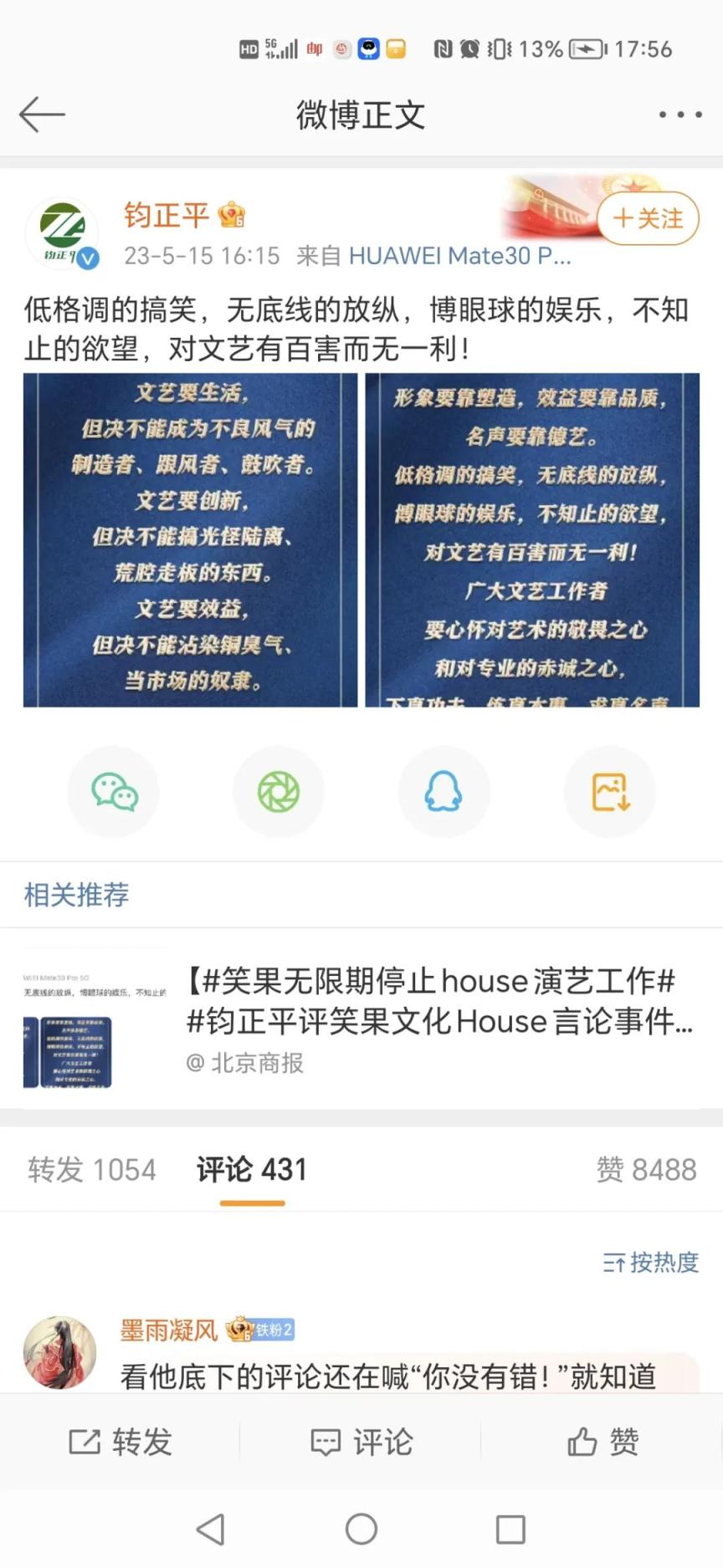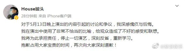 演员House自己也在微博上发布了道歉声明,承认错误并表示将遵从笑果的处罚决定。