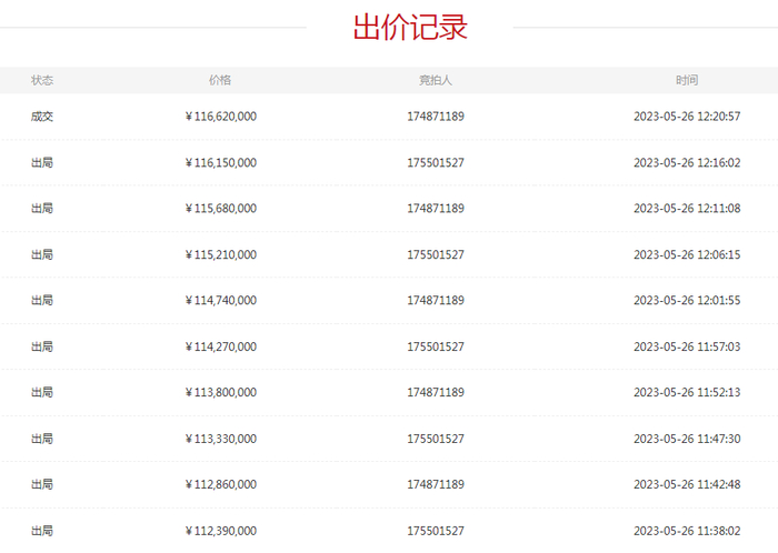 25日10时-26日10时为原定拍卖时间,“174871189”号竞买人在25日晚间率先出手报出底价9500万元,第二位“175501527”竞买人显然很坐得住,直至26日9时40分才开始跟报9594万元。